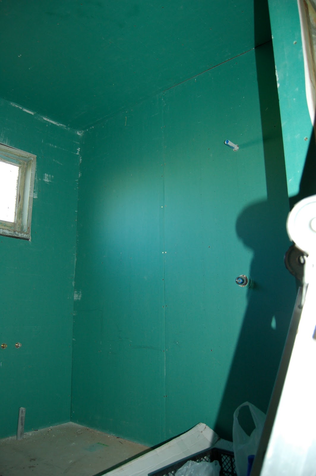 It's dark in the photo because this was taken at the end of our work day at about 5.15pm. We're moving on to May and it gets dark by about 6.30pm. The Gib is all different colours: blue is the Braceline, white is ordinary and green is Aqualine for use in the bathroom and kitchen. The kitchen is lined also.